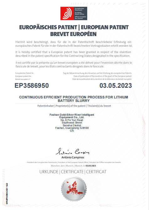 近期,由佛山市金銀河智能裝備股份有限公司申請的發(fā)明專利——一種鋰電池漿料連續(xù)化高效生產(chǎn)工藝,正式獲得由歐洲專利局(EPO)頒發(fā)的專利證書(專利號:EP3586950)。