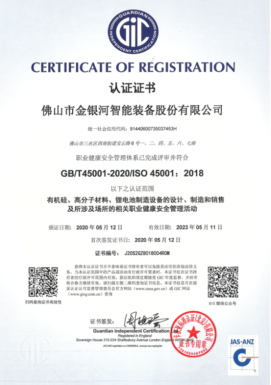 2020年5月,金銀河“職業(yè)健康安全管理體系”完成評(píng)審并符合GB/T45000-2020/ISO 45001:2018,認(rèn)證范圍包括有機(jī)硅、高分子材料、鋰電池制造設(shè)備的設(shè)計(jì)、制造和銷售及所涉及場所的相關(guān)環(huán)境管理活動(dòng)。