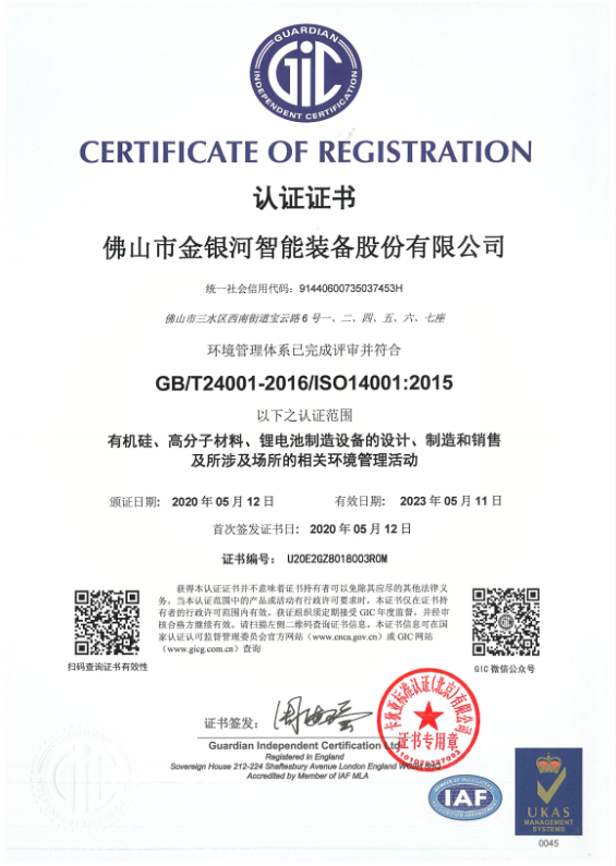 2020年5月,金銀河“環境管理體系”完成評審并符合GB/T24001-2016/ISO 14001:2015,認證范圍包括有機硅、高分子材料、鋰電池制造設備的設計、制造和銷售及所涉及場所的相關職業健康安全管理活動。