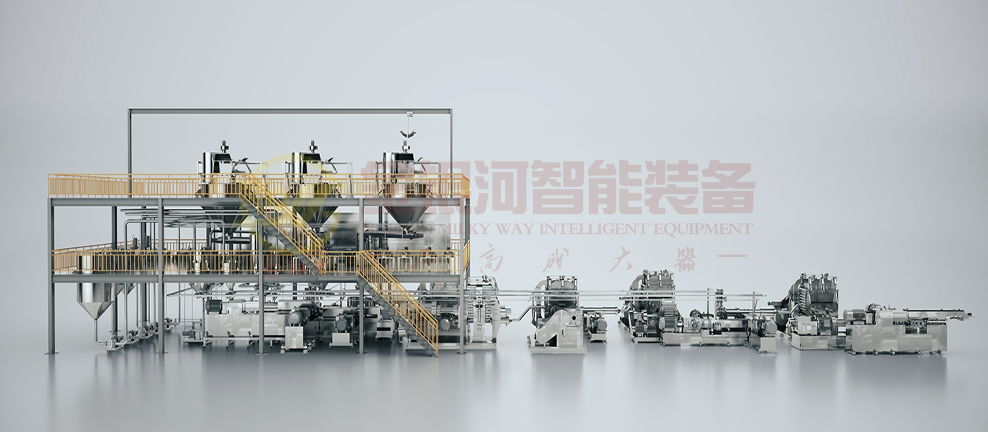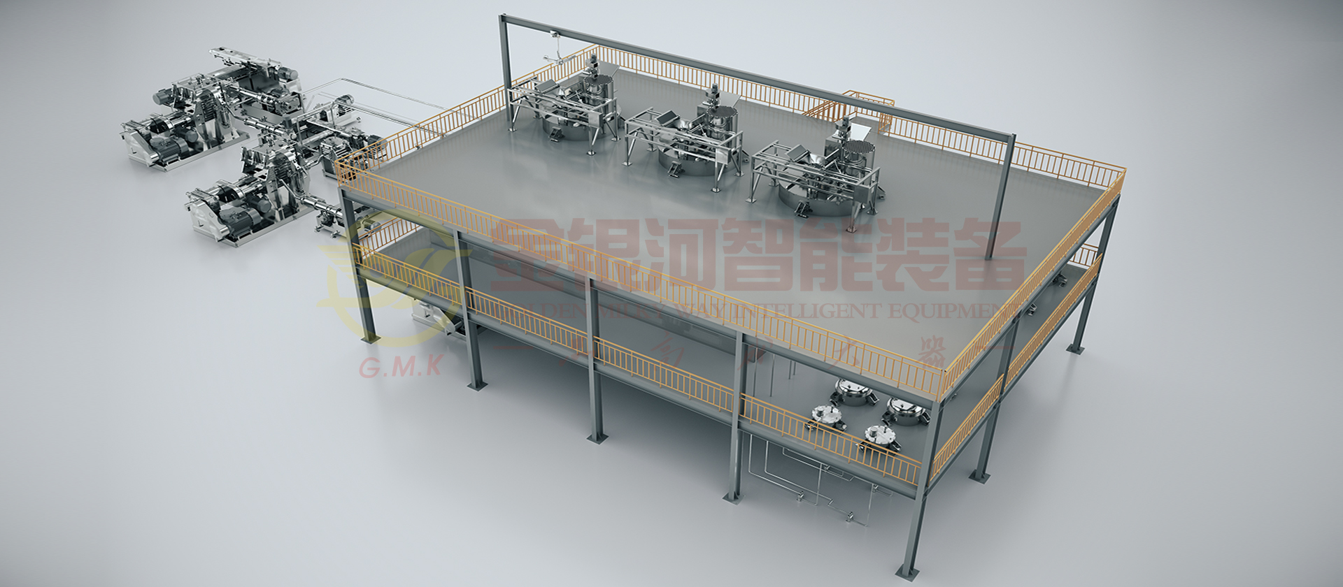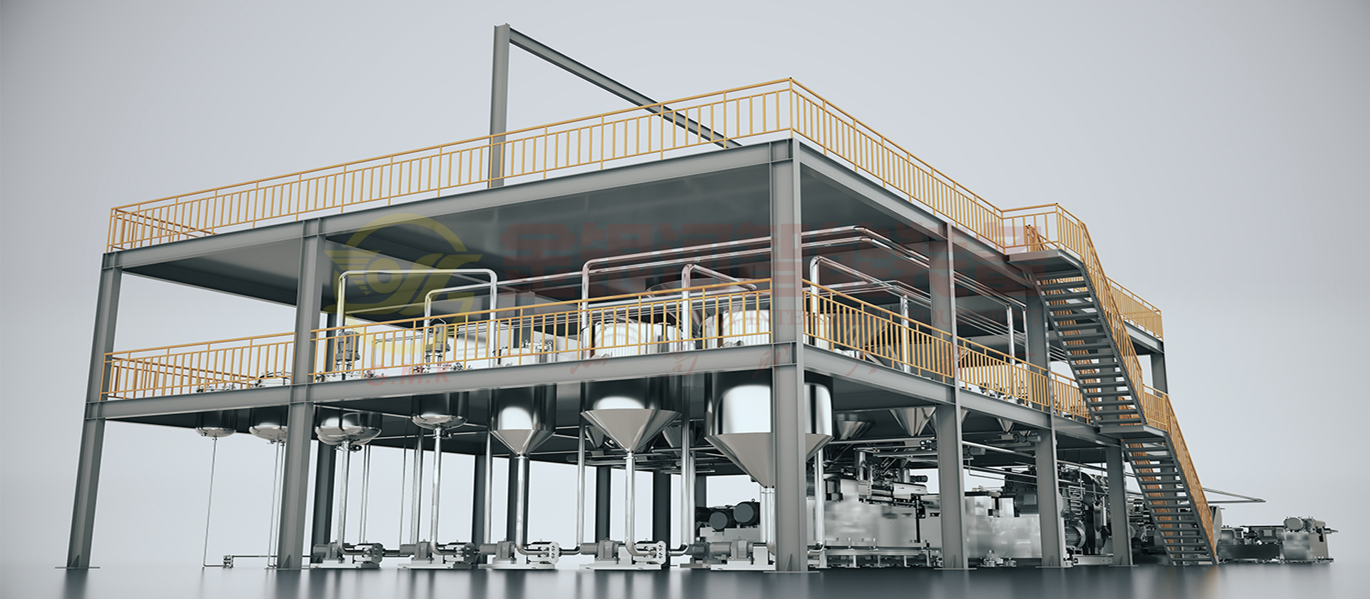 由計量斗、稱量及輸送系統(tǒng)、貯罐、多工位出料機,增壓機、靜態(tài)混合機、雙螺桿螺旋混合機、輔助設備及DCS中央控制系統(tǒng)組成。液體的原材料(粉體與液體)通過精確的計量系統(tǒng)在線自動和連續(xù)輸送到螺旋混合機中,液體膠的原材料(粉體與液體)通過精確的計量系統(tǒng)在線自動和連續(xù)輸送到螺旋混合機中,分三段完成粉液混合,對產(chǎn)能大大提高,產(chǎn)出基料后進入多工位機臨存反應,再通過雙螺桿螺旋混合機完成混合、分散、研磨、抽真空等完成基膠后進入在線靜態(tài)混合機加入助劑再次混合,經(jīng)雙螺桿螺旋混合機在線冷卻后包裝。它的生產(chǎn)效率高,適合大規(guī)模生產(chǎn);它具有自動化程度高,杜絕物料直接接觸空氣,產(chǎn)品質量穩(wěn)定性好,物料及能源損耗少等優(yōu)點。