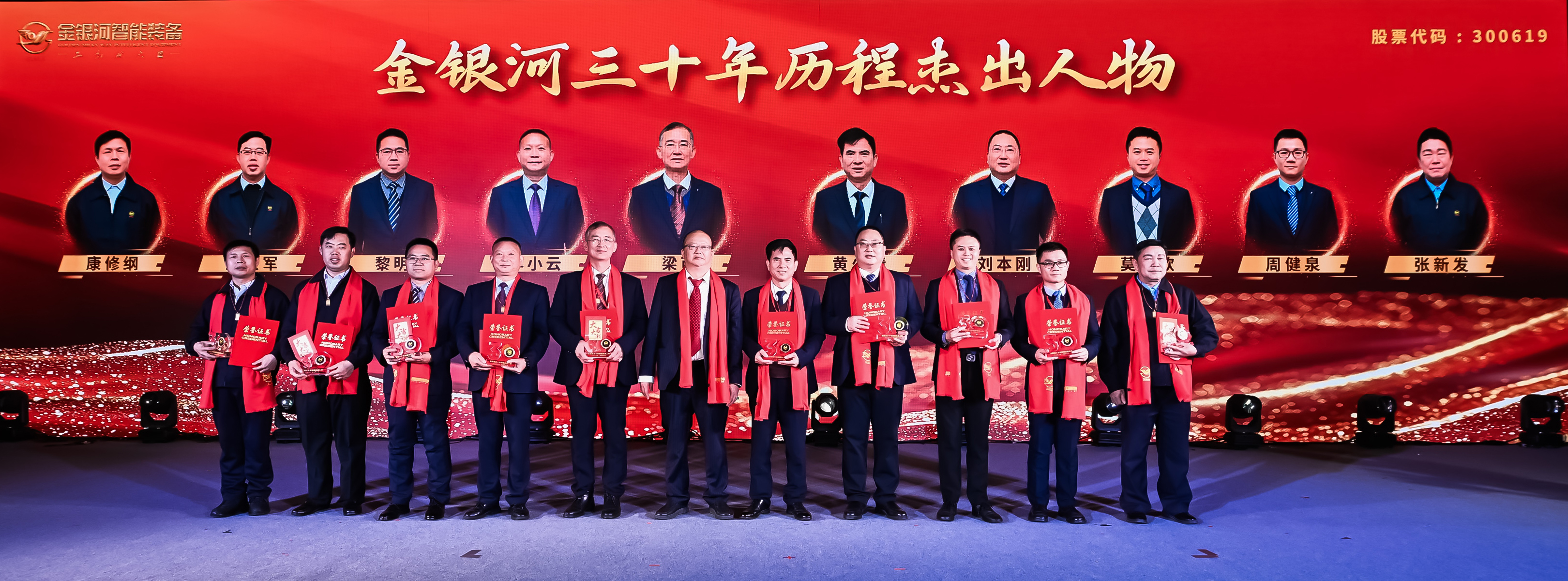 金銀河三十年歷程杰出人物頒獎儀式。董事長張啟發先生親自為十名杰出人物頒獎,向這些企業脊梁代表致以崇高的表揚,是他們與1500多名員工一道,共同創造金銀河的輝煌歷程。
